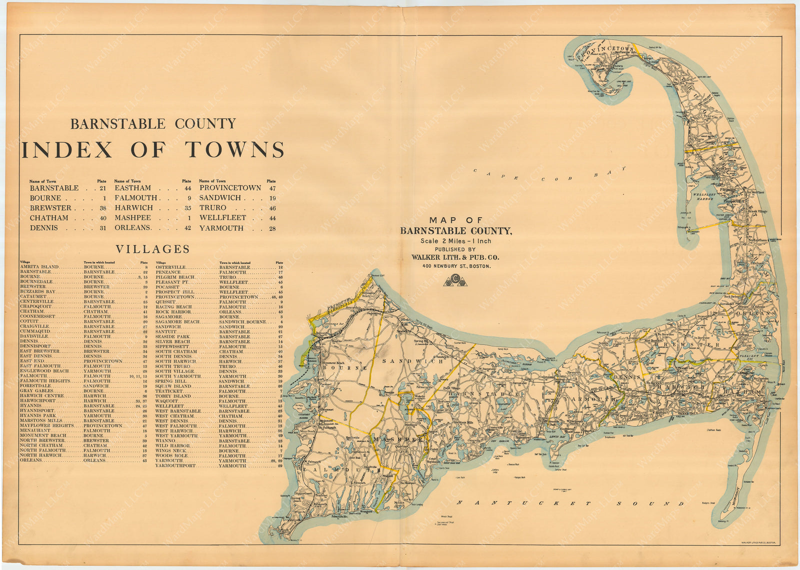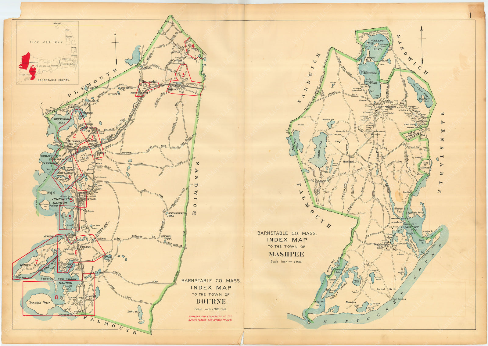 Atlas of Barnstable County, Massachusetts. Towns of Bourne, Mashpee, Falmouth, Sandwich, Barnstable, Yarmouth, Dennis, Harwich, Brewster, Chatham, Orleans, Eastham, Wellfleet, Truro & Provincetown. From Official Plans and Actual Surveys. 1910