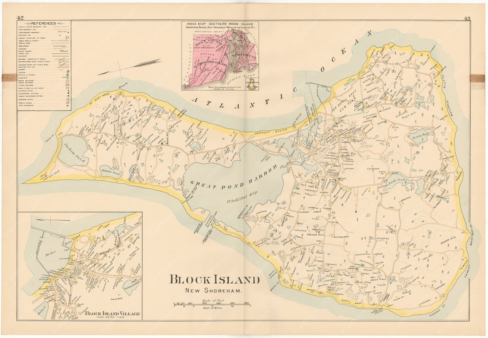 New Topographical Atlas of Surveys Southern Rhode Island, Comprising the Counties of Newport, Bristol, Kent, and Washington. Containing Forty-One Double Page Maps, in Colors, of the Cities, Towns, and Counties, Together with Double Page Index Maps of the Cities of Providence and Newport, and a Driving Map of the State, Showing all Roads in Color.