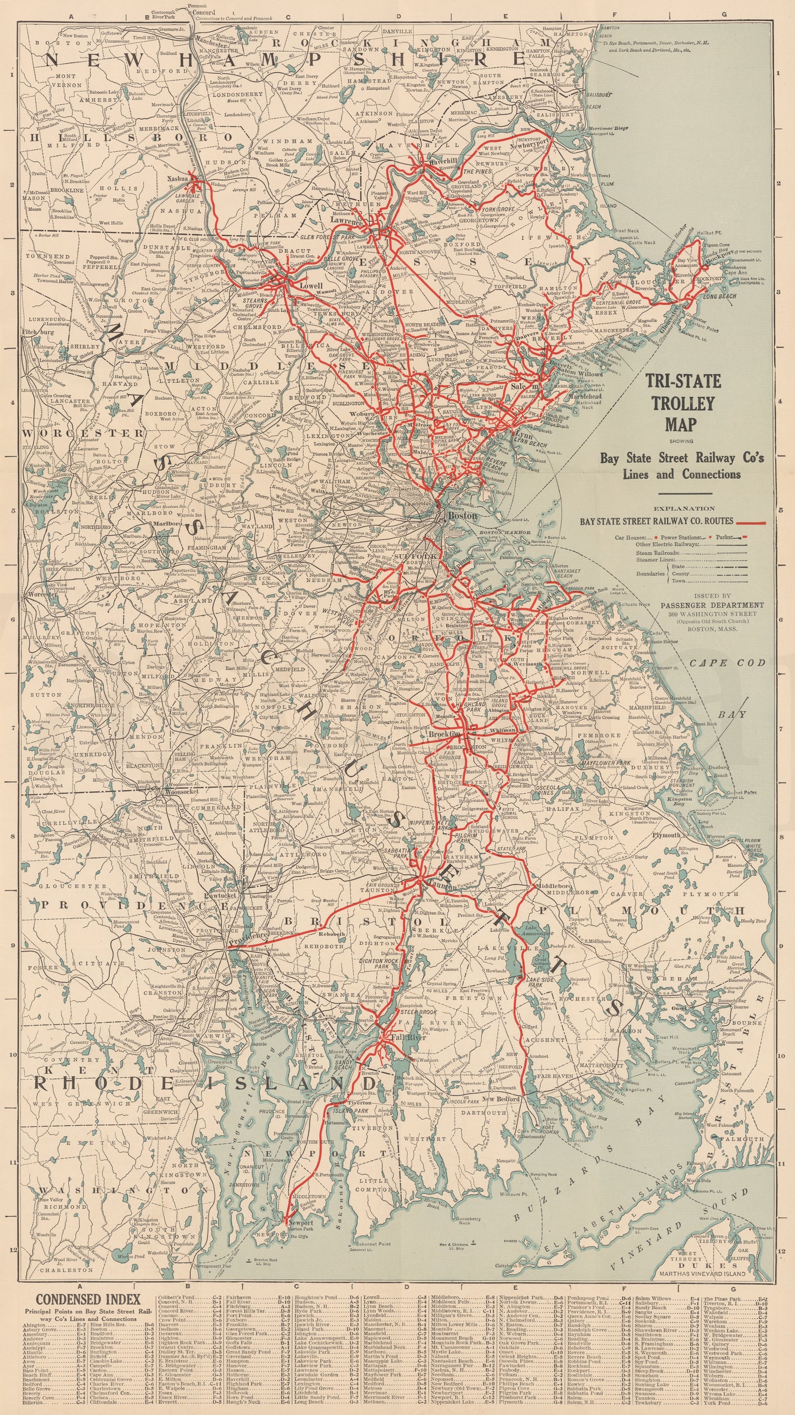 Tri-State Trolley Map (Massachusetts, New Hampshire, Rhode Island) 1913