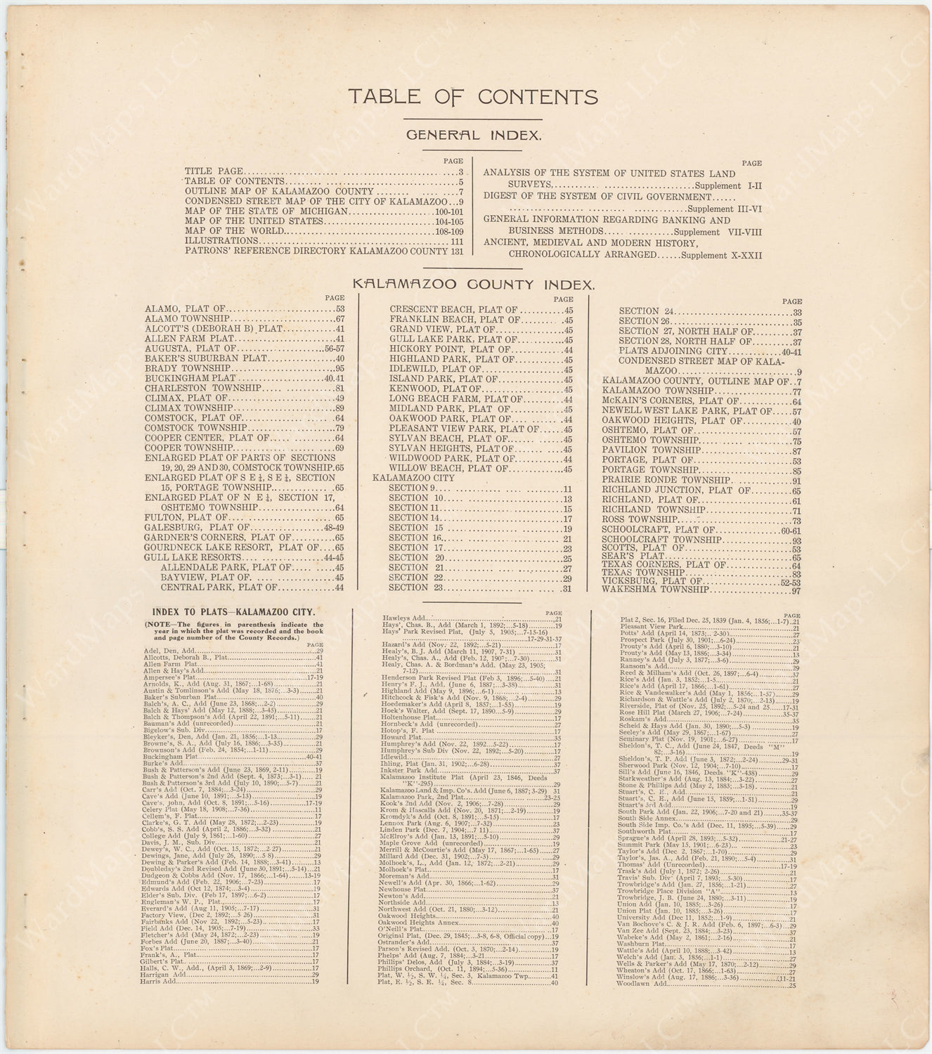 Kalamazoo County, Michigan 1910 Table of Contents