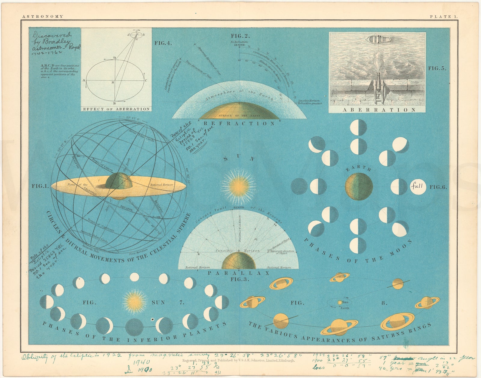 Astronomy c1910 Plate 01: Refraction, Phases of Moon, Movements of Celestial Sphere, etc.