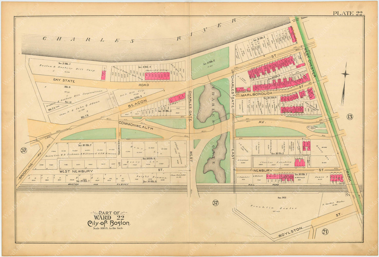 What are Cadastral Maps? We specialize in cadastral maps, cartographic time capsules representing the natural and built forms of locales across America. Cadastral maps represent structures, building materiality, property ownership, and infrastructure. Cadastral maps were used by municipalities, real estate firms, attorneys, surveyors, insurance companies and others that needed a detailed record of where properties were located, what was built on them, and who owned them. Cadastral map makers used a graphic code of bright colors to indicate the construction types of the buildings, i.e. pink for brick and yellow for wood. Cadastral maps were published to paying subscribers in bound atlases. Each cadastral atlas depicted a specific county, city or neighborhood and typically had 20-40 maps known as "plates." Each plate showed a specific geographic area, usually only a few city blocks or a portion of a town. A few plates depicted part or all of one city ward, hence our moniker, "ward maps."