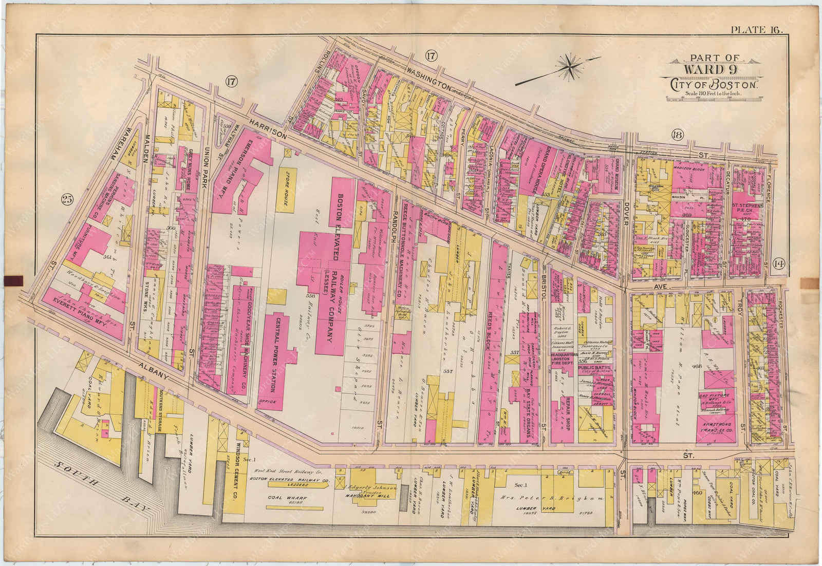 A real estate map of Boston’s South End shows the Central Power Station, initially opened by the West End, labeled “Boiler House.” The “Coal Wharf” on the edge of the South Bay is where the fossil fuel for the power station’s steam boilers was off loaded from barges.