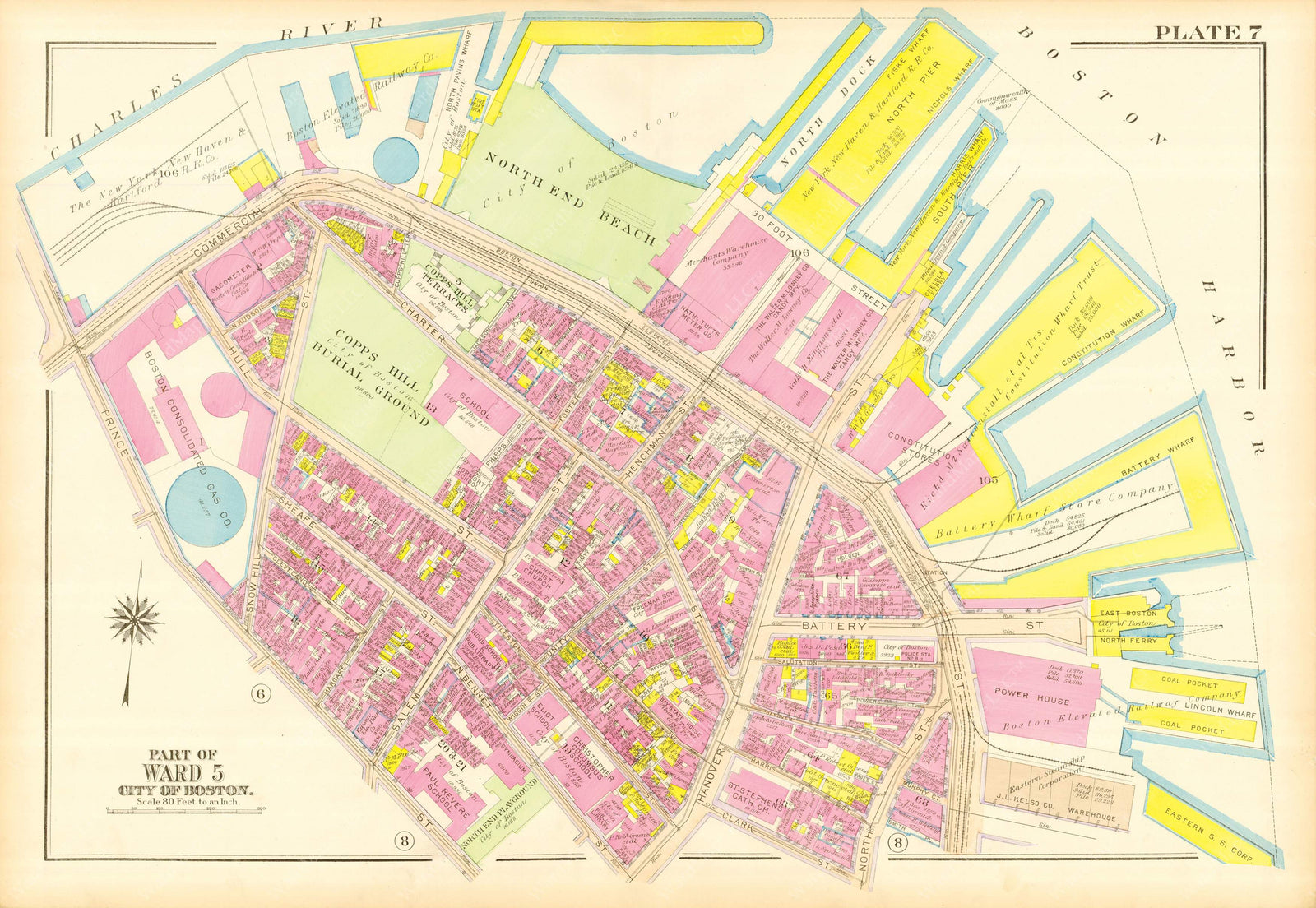 On a real estate map of the North End, the Atlantic Avenue Elevated, represented by a pair of parallel dashed lines, follows the grand arc of Commercial Street. Tracks of the Union Freight Railroad, represented by dark lines with cross ticks, trace Commercial Street and the el. To the west of “North End Beach” is a waterfront parcel of land with “Boston Elevated Railway Co.” indicated as its owner (top left). On the parcel is a blue circle representing the infamous molasses tank that burst on January 15, 1919.