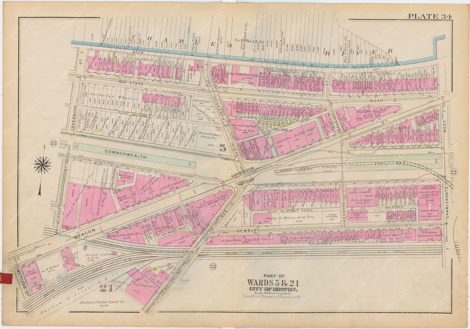 • What are Cadastral Maps? We specialize in cadastral maps, cartographic time capsules representing the natural and built forms of locales across America. Cadastral maps represent structures, building materiality, property ownership, and infrastructure. Cadastral maps were used by municipalities, real estate firms, attorneys, surveyors, insurance companies and others that needed a detailed record of where properties were located, what was built on them, and who owned them. Cadastral map makers used a graphic code of bright colors to indicate the construction types of the buildings, i.e. pink for brick and yellow for wood. Cadastral maps were published to paying subscribers in bound atlases. Each cadastral atlas depicted a specific county, city or neighborhood and typically had 20-40 maps known as "plates." Each plate showed a specific geographic area, usually only a few city blocks or a portion of a town. A few plates depicted part or all of one city ward, hence our moniker, "ward maps."