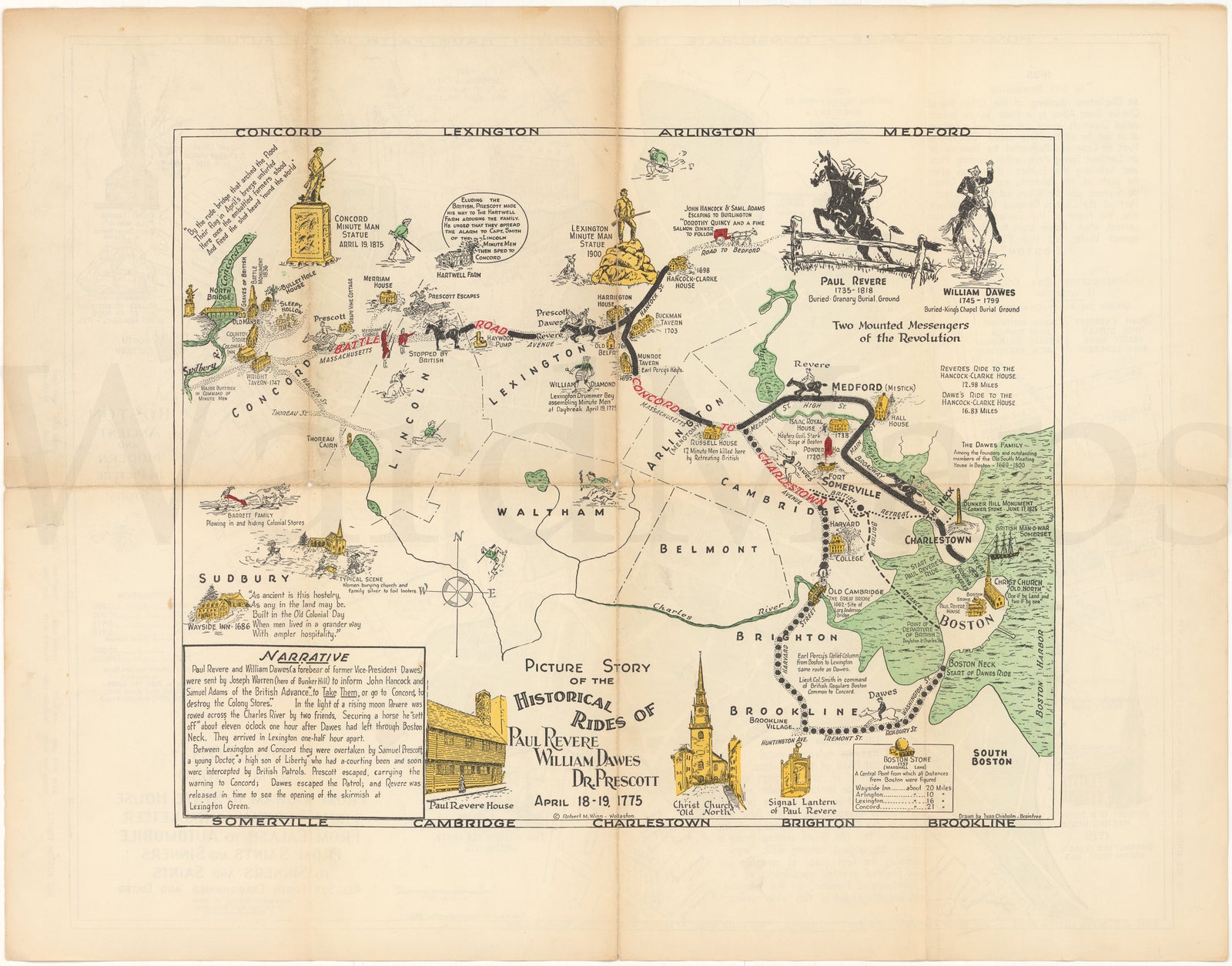 Notes: This map is double sided. If you purchase the authentic antique map, BOTH sides of the map will be included, as each side is one one side of the same piece of paper. Here is what the other side of the map looks like. If you purchase a reproduction ONLY the city map will be printed. To purchase a reproduction of the rides of Revere, Dawes and Prescott, you need to purchase a reproduction of this map.