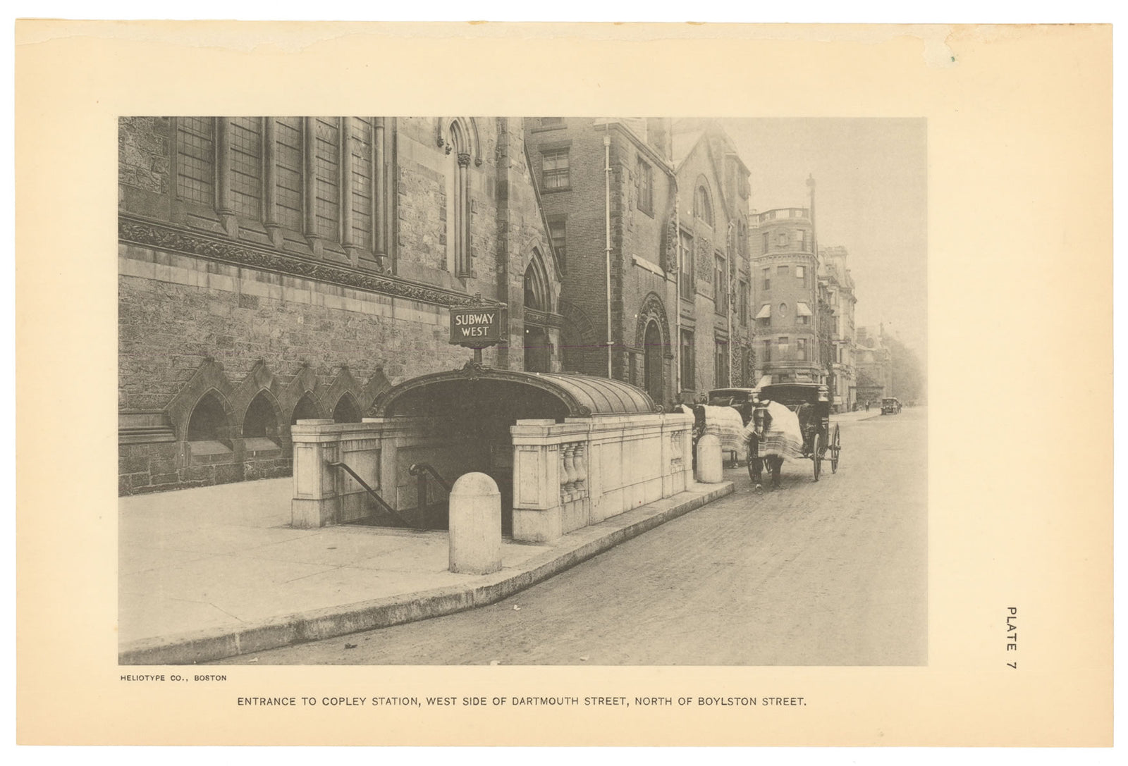 Next to the Old South Church (left), a simple covered stairway served as an entrance to the westbound side of Copley Station. Though the last horse-drawn streetcar disappeared from the Back Bay in 1901, private horse-drawn carriages (right) remained in use.