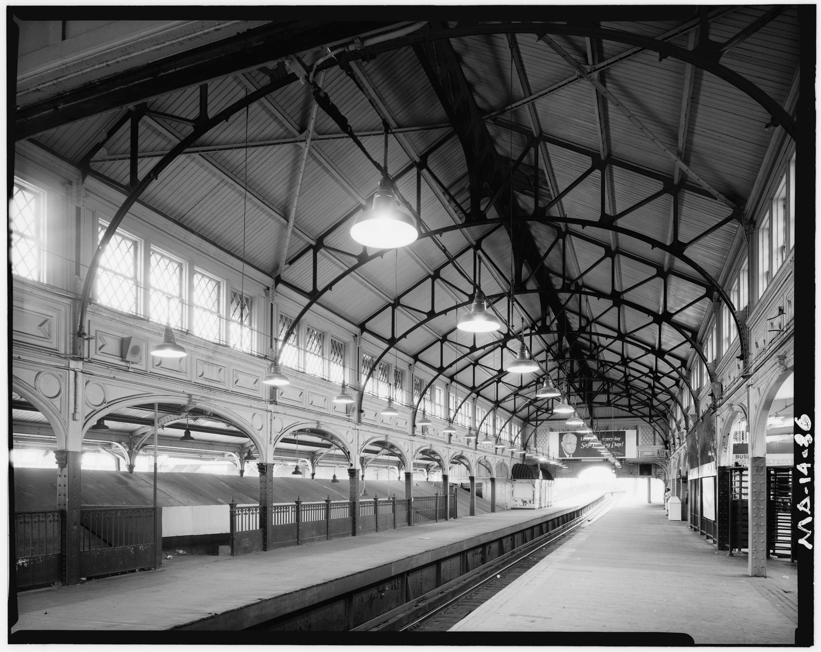 Notes: Interior view of Dudley Street Station Mainline Northbound platform looking North. Photograph of the Washington Street Elevated / Forest Hills Extension (Southern portions of the Main Line Elevated) 1982. Taken by the federal Historic American Engineering Record (HAER), photograph captures the elevated railway structures and stations of the then southern half of the MBTA's Orange Line. After the Orange Line was relocated to the Southwest Corridor in 1987, the elevated structures and stations were demolished.