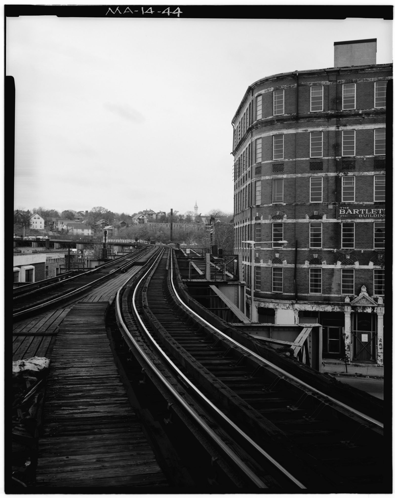 Notes: Dudley Street Station. View from Tower 'F' - looking South - toward Bartlett Street Garage site of the former Guild Street elevated storage yard. The Bartlett Building (burned June 27, 1982) is on the right. Photograph of the Washington Street Elevated / Forest Hills Extension (Southern portions of the Main Line Elevated) 1982. Taken by the federal Historic American Engineering Record (HAER), photograph captures the elevated railway structures and stations of the then southern half of the MBTA's Orange Line. After the Orange Line was relocated to the Southwest Corridor in 1987, the elevated structures and stations were demolished.