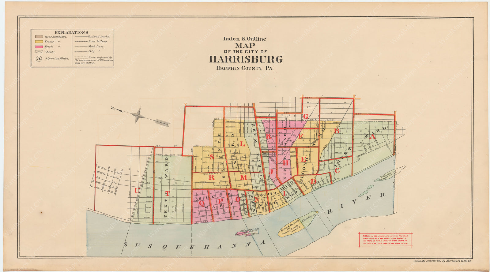 • What are Cadastral Maps? We specialize in cadastral maps, cartographic time capsules representing the natural and built forms of locales across America. Cadastral maps represent structures, building materiality, property ownership, and infrastructure. Cadastral maps were used by municipalities, real estate firms, attorneys, surveyors, insurance companies and others that needed a detailed record of where properties were located, what was built on them, and who owned them. Cadastral map makers used a graphic code of bright colors to indicate the construction types of the buildings, i.e. pink for brick and yellow for wood. Cadastral maps were published to paying subscribers in bound atlases. Each cadastral atlas depicted a specific county, city or neighborhood and typically had 20-40 maps known as "plates." Each plate showed a specific geographic area, usually only a few city blocks or a portion of a town. A few plates depicted part or all of one city ward, hence our moniker, "ward maps."