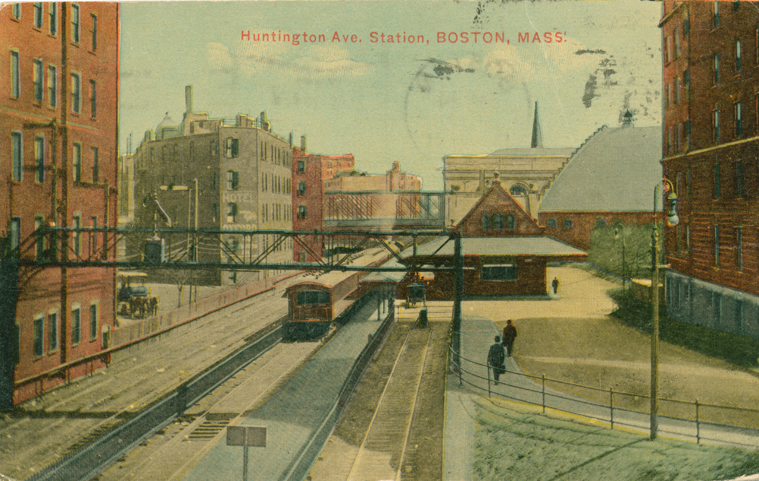 An easterly view from the Huntington Avenue bridge over the tracks of the Boston & Albany reveals a train paused at the railroad’s second depot to serve the location. The station was served by trains heading inbound to South Station.