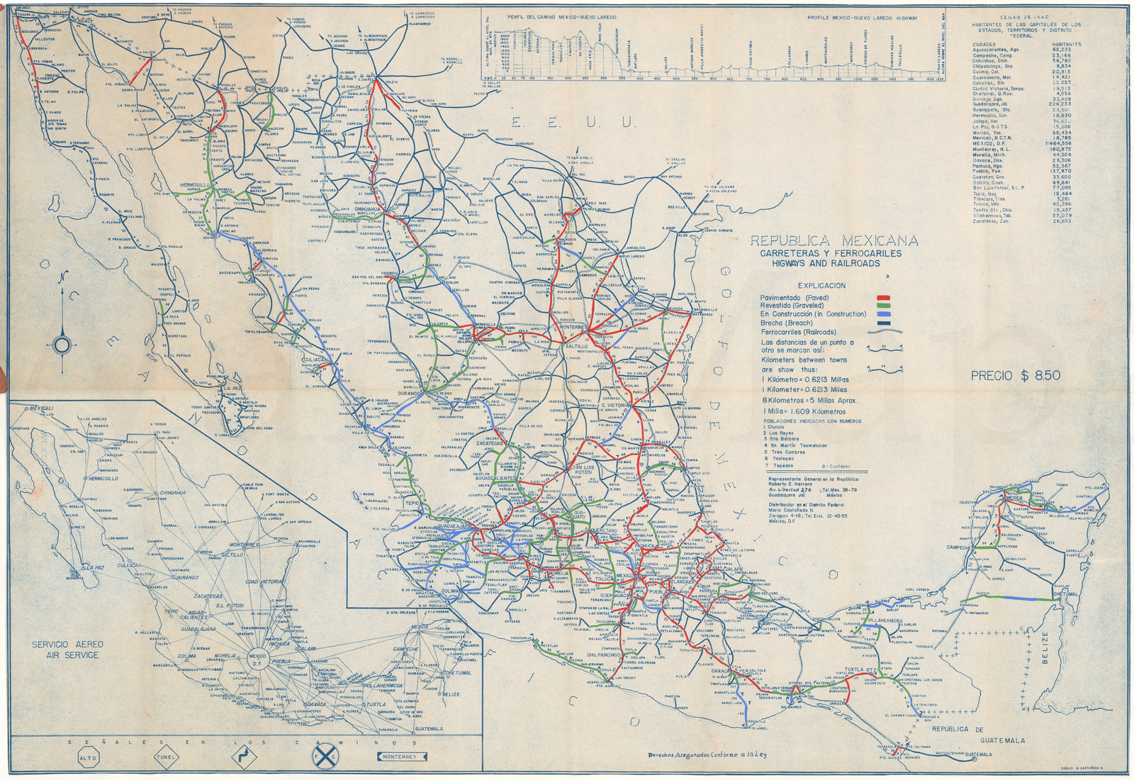 Mexico 1947-48: Hand-Colored Roads and Railroads Map