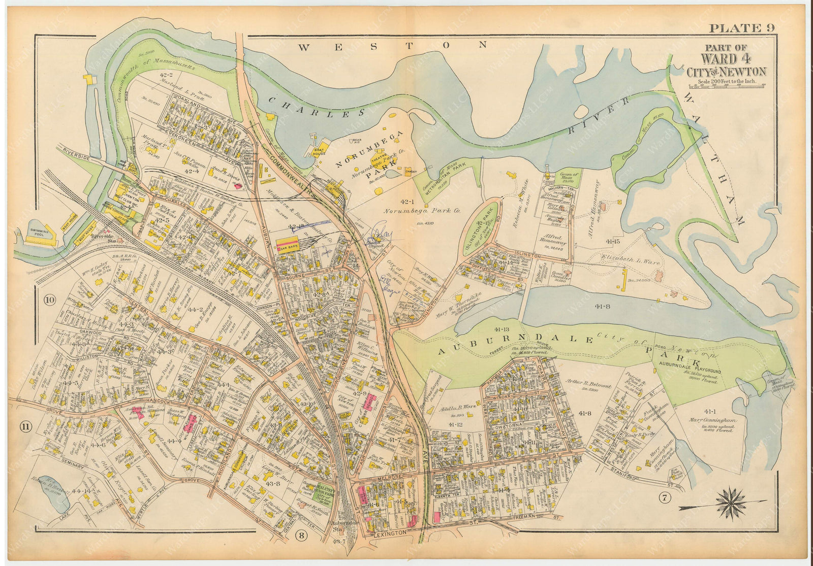 In the Auburndale Section of Newton streetcar tracks (black and white lines) run along Commonwealth Avenue and pass through to a combination station and restaurant (center) at Norumbega Park. “Bear Pit” and “Boat House” are attractions noted within the park. Across the street from the station are a streetcar barn (bottom left) and storage tracks (left).