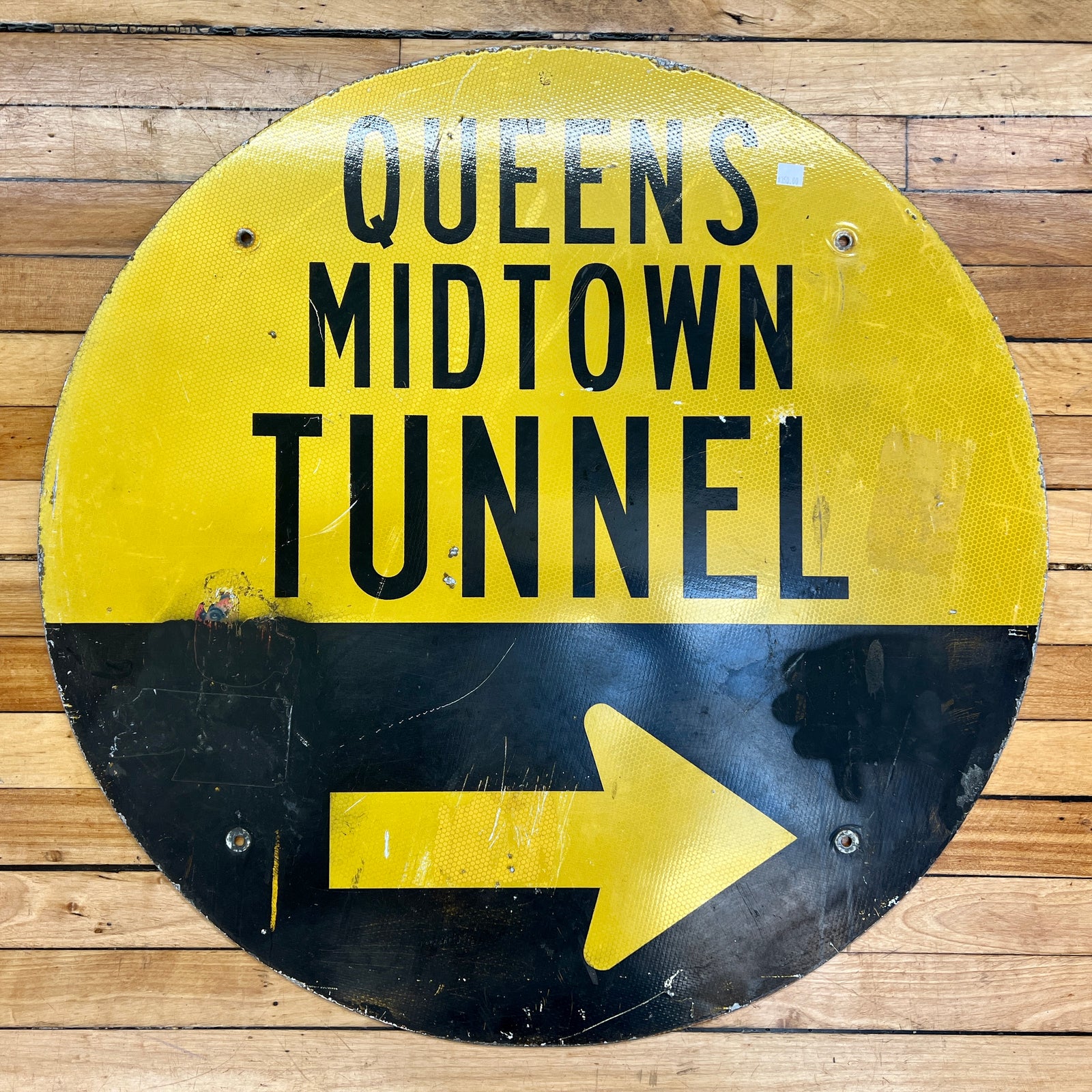 Description: Authentic vintage New York City road sign. Text reads, "QUEENS MIDTOWN TUNNEL" in black letters on yellow background. Below text is a yellow arrow pointing right on black background.