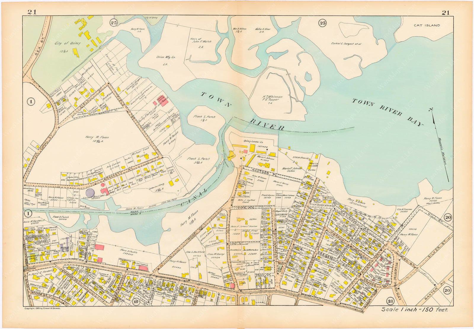 • What are Cadastral Maps? We specialize in cadastral maps, cartographic time capsules representing the natural and built forms of locales across America. Cadastral maps represent structures, building materiality, property ownership, and infrastructure. Cadastral maps were used by municipalities, real estate firms, attorneys, surveyors, insurance companies and others that needed a detailed record of where properties were located, what was built on them, and who owned them. Cadastral map makers used a graphic code of bright colors to indicate the construction types of the buildings, i.e. pink for brick and yellow for wood. Cadastral maps were published to paying subscribers in bound atlases. Each cadastral atlas depicted a specific county, city or neighborhood and typically had 20-40 maps known as "plates." Each plate showed a specific geographic area, usually only a few city blocks or a portion of a town. A few plates depicted part or all of one city ward, hence our moniker, "ward maps."