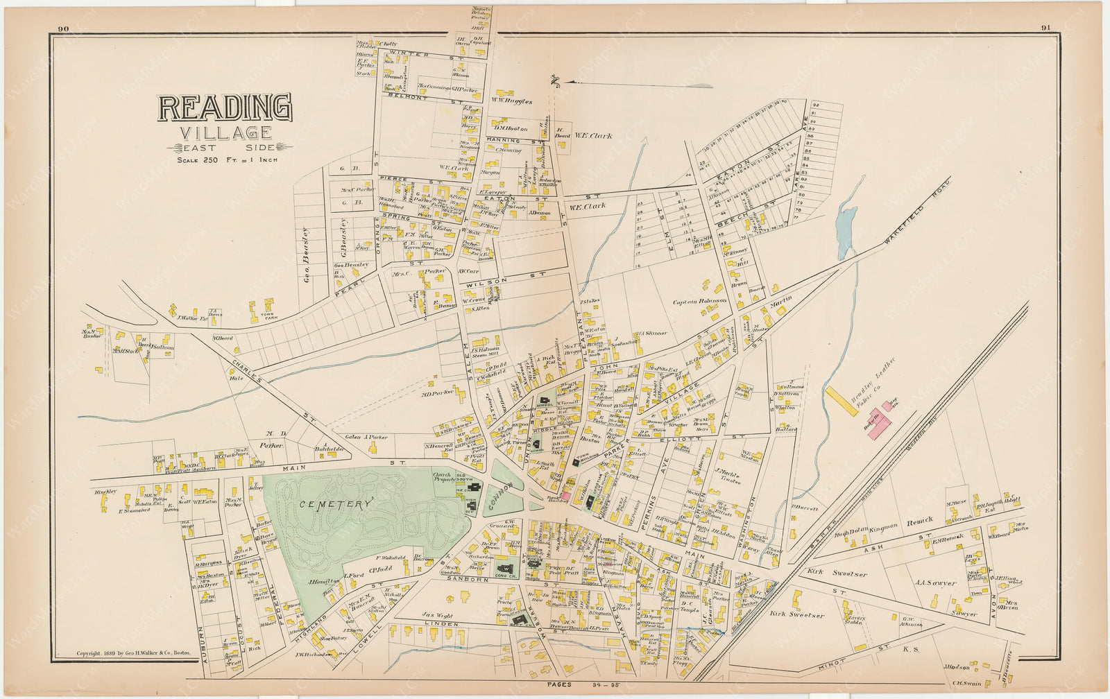 What are Cadastral Maps? We specialize in cadastral maps, cartographic time capsules representing the natural and built forms of locales across America. Cadastral maps represent structures, building materiality, property ownership, and infrastructure. Cadastral maps were used by municipalities, real estate firms, attorneys, surveyors, insurance companies and others that needed a detailed record of where properties were located, what was built on them, and who owned them. Cadastral map makers used a graphic code of bright colors to indicate the construction types of the buildings, i.e. pink for brick and yellow for wood. Cadastral maps were published to paying subscribers in bound atlases. Each cadastral atlas depicted a specific county, city or neighborhood and typically had 20-40 maps known as "plates." Each plate showed a specific geographic area, usually only a few city blocks or a portion of a town. A few plates depicted part or all of one city ward, hence our moniker, "ward maps."