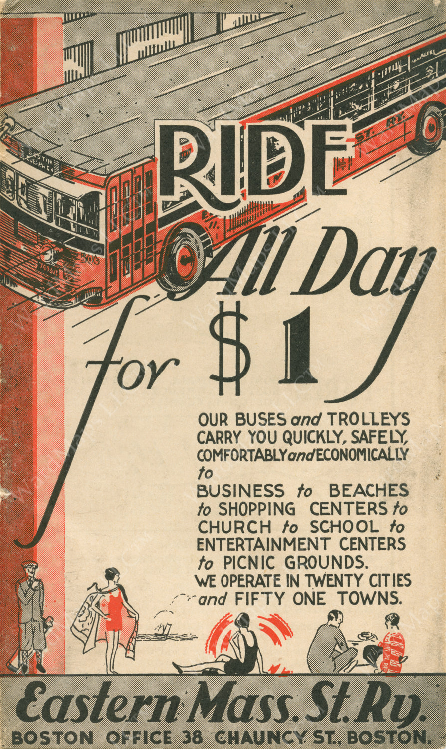 Covers of pocket-sized guides published by the Eastern Massachusetts Street Railway Company beckon riders to “Ride All Day for $1.00.”