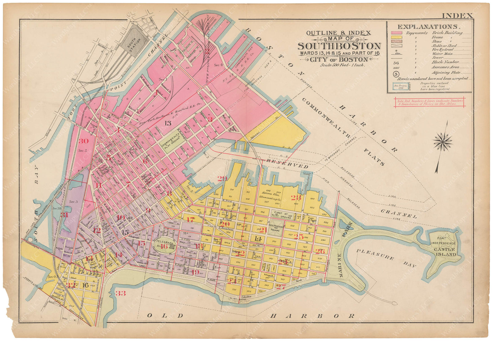 • What are Cadastral Maps? We specialize in cadastral maps, cartographic time capsules representing the natural and built forms of locales across America. Cadastral maps represent structures, building materiality, property ownership, and infrastructure. Cadastral maps were used by municipalities, real estate firms, attorneys, surveyors, insurance companies and others that needed a detailed record of where properties were located, what was built on them, and who owned them. Cadastral map makers used a graphic code of bright colors to indicate the construction types of the buildings, i.e. pink for brick and yellow for wood. Cadastral maps were published to paying subscribers in bound atlases. Each cadastral atlas depicted a specific county, city or neighborhood and typically had 20-40 maps known as "plates." Each plate showed a specific geographic area, usually only a few city blocks or a portion of a town. A few plates depicted part or all of one city ward, hence our moniker, "ward maps."