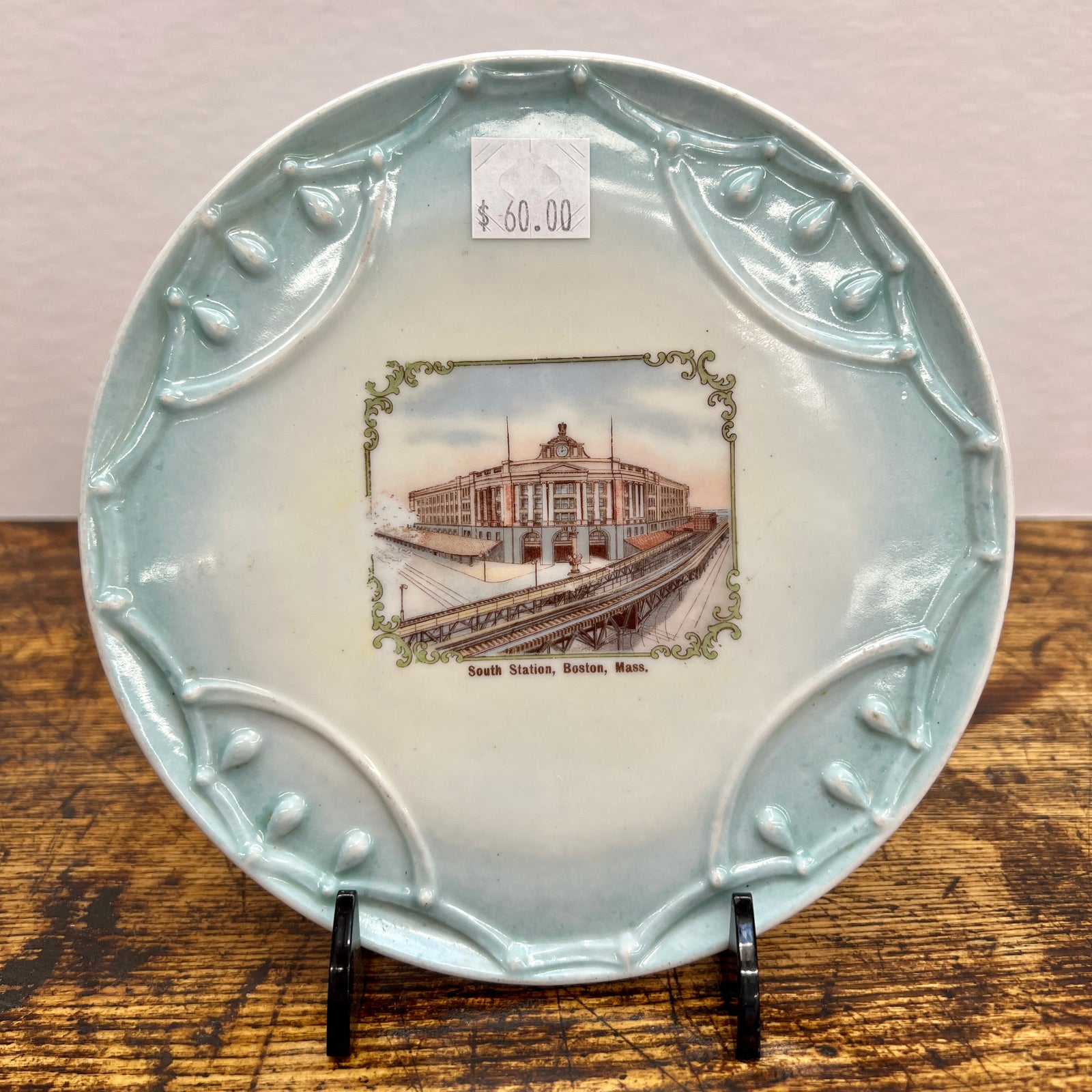Description: Authentic antique porcelain plate with an image of "South Station, Boston, Mass." in the center. Made in Germany.